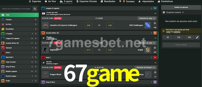O 67game oferece uma grande seleção de opções de apostas em e-sports com probabilidades competitivas